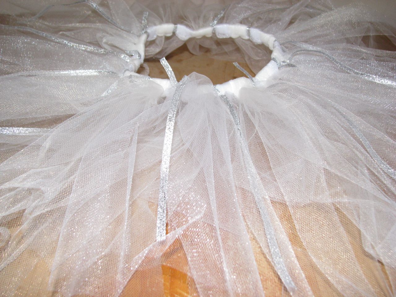 For the veil, I got a french-clasp barrette and tied strips of tulle to it. I then hot glued some rhinestones and white flowers to it. I did the barrette so the veil would stay in her hair through all of her playing!